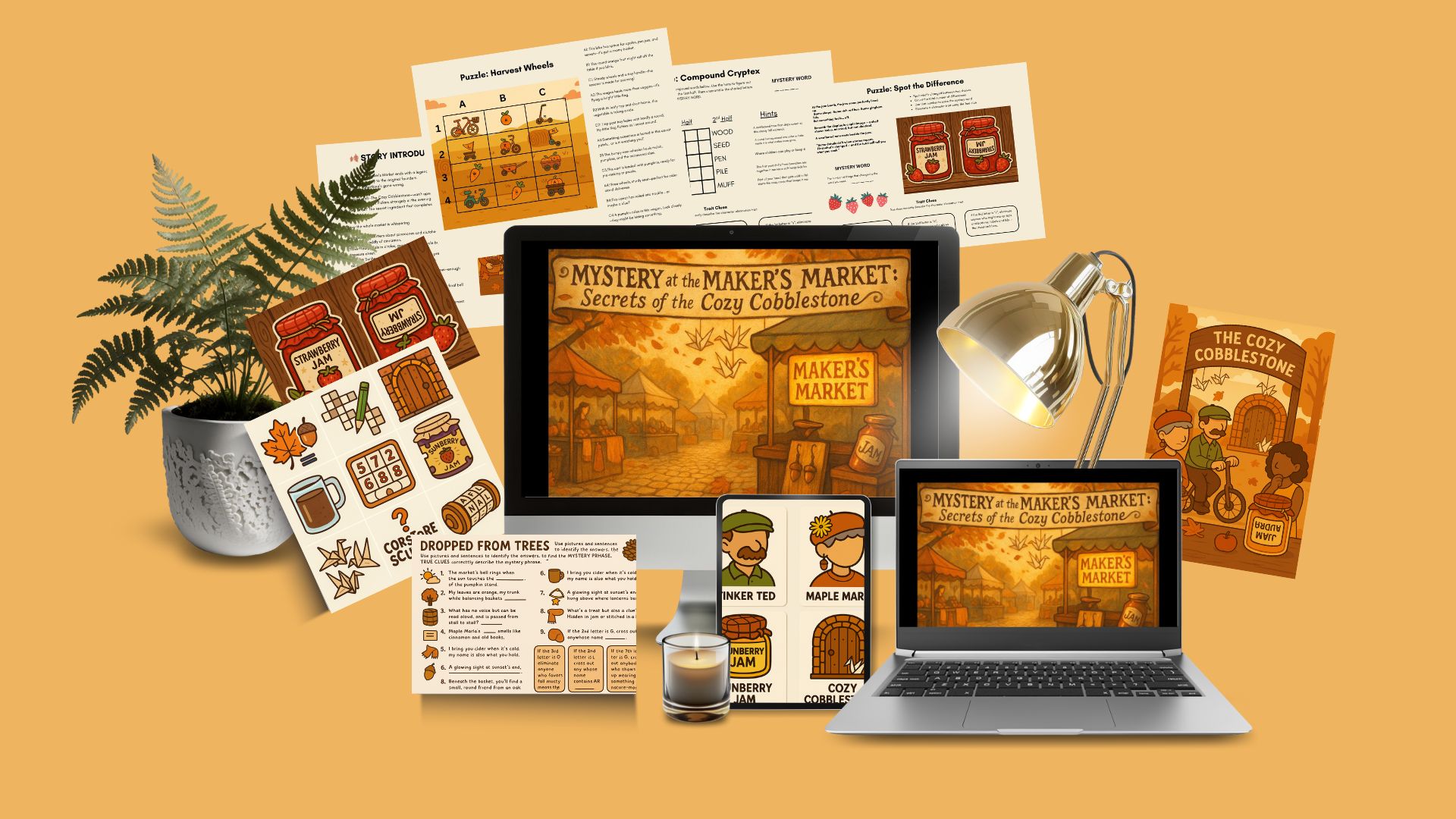 One sparks imagination—kids craft, build, and roleplay in their very own fall market. The other adds mystery, inviting them to solve a puzzle-filled escape room set in that same market world. Each kit stands on its own, but together they create a magical blend of creativity and challenge for an unforgettable autumn celebration.