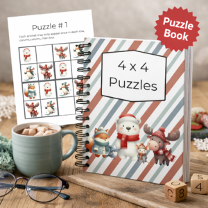 This hands-on animal puzzle set is designed to make learning feel like play. With both 4×4 and 6×6 logic puzzles, kids physically place animal pieces onto the board to solve each puzzle. It’s screen-free, reusable, and engaging in a way worksheets alone rarely are.