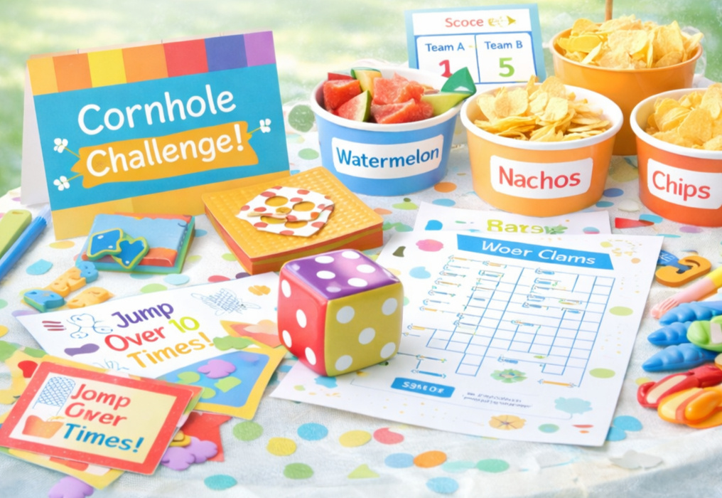 Includes: Printable yard game cards, snack bar labels, celebration signs, activity challenges, and simple outdoor party decor